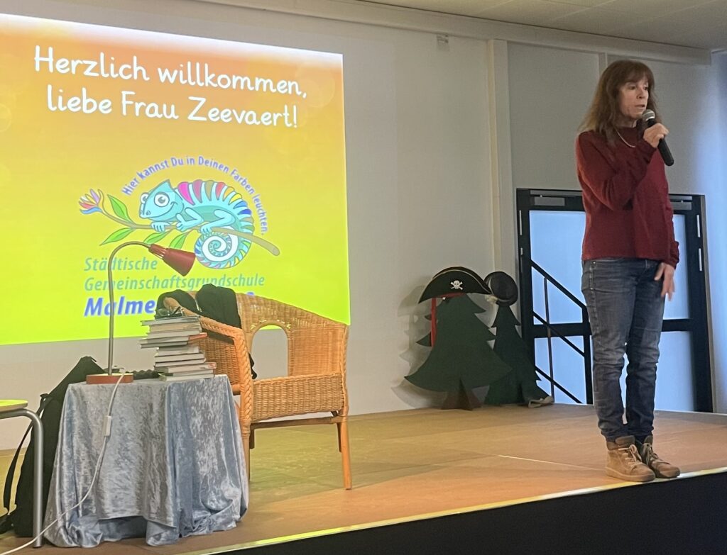 Zum Vorlesetag am Freitag, den 21. November war die Aachener Autorin Sigrid Zeevaert bei uns zu Gast und hat aus ihren Büchern „Emma und Paul“ sowie „Nuria“ gelesen und erzählt und uns begeistert.